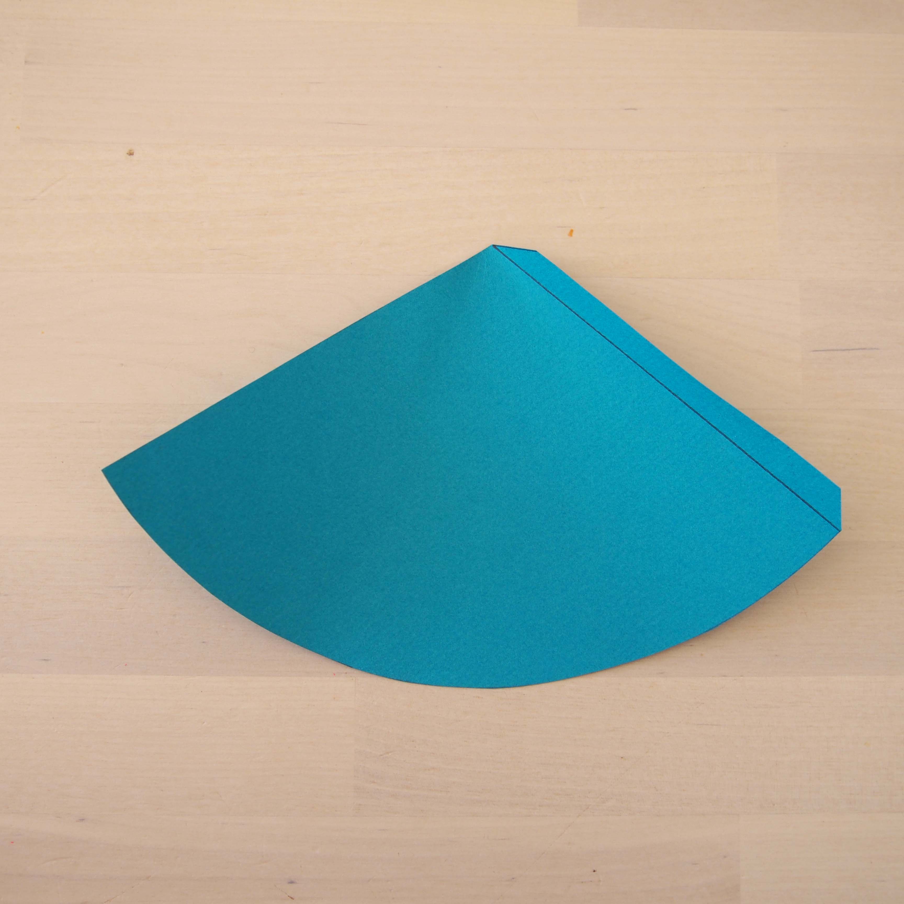 Chacune de ces 2 moitiés va vous servir à réaliser un cône en enroulant le papier sur lui même. En fonction de la largeur du cône souhaitée, vous serez peut être amener à redimensionner votre moitié de cercle, comme ci dessous. Pour obtenir un cône plus étroit, j’ai de nouveau recoupé ma moitié de cercle.
